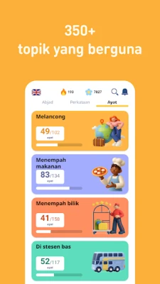 Selami lautan pengetahuan dengan FunEasyLearn. Aplikasi ini menyimpan khazanah lebih 6,000 perkataan (kata nama, kerja, sifat, dan lain-lain) yang sentiasa berkembang, disusun rapi dalam 7 tahap dan 120 topik untuk pembelajaran yang terstruktur. Selain itu, anda akan menemui 5,000 frasa perbualan harian dan untuk perjalanan yang paling penting, dikategorikan dalam 10 tahap dan 200 topik. Setiap elemen dilengkapi dengan ilustrasi lukisan tangan yang intuitif untuk membantu ingatan visual dan rakaman audio profesional daripada penutur asli untuk penyebutan yang tepat. Berinteraksi melalui permainan mendengar, menulis, dan bertutur yang direka khas untuk mengukuhkan pemahaman anda.