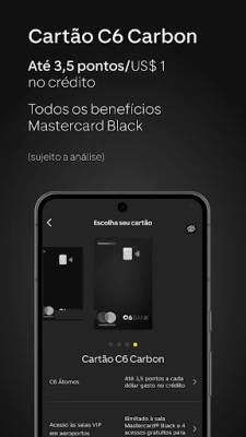 Tingkatkan pengalaman perbankan anda dengan rangkaian kad kredit eksklusif C6 Bank. Dapatkan ganjaran lumayan dengan C6 Carbon, menawarkan sehingga 3.5 mata bagi setiap USD 1 yang dibelanjakan dan akses tanpa had ke ruang rehat VIP Mastercard Black di Guarulhos, serta kemudahan C6 Tag percuma untuk tol. Untuk pilihan yang lebih mudah, C6 Black dan C6 Platinum turut menyediakan faedah menarik termasuk mata ganjaran, pulangan tunai, dan manfaat Mastercard. Di samping itu, urusan pembayaran harian menjadi lebih pantas dan selamat dengan integrasi dompet digital utama dan keupayaan untuk melakukan Pix terus dari Google Wallet, membolehkan pemindahan dana segera tanpa perlu membuka aplikasi perbankan.