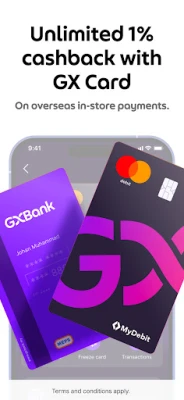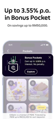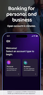 Alami revolusi perbankan digital dengan GXBank, aplikasi yang direka untuk memperkasakan kehidupan kewangan anda dengan mudah dan inovasi. Untuk urusan peribadi, capai impian anda dengan kemudahan kredit `FlexiCredit` yang menawarkan had sehingga RM150,000 tanpa sebarang caj, membolehkan anda mengeluarkan tunai serta-merta ke Akaun GX anda apabila diperlukan. Maksimakan potensi simpanan anda melalui `Poket Bonus`, nikmati kadar faedah sehingga 4.00% p.a. untuk baki sehingga RM50,000, memastikan wang anda berkembang dengan lebih pantas.