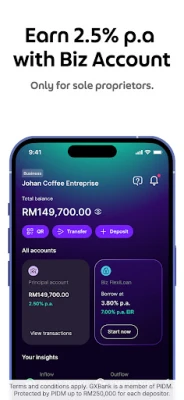 GXBank turut menyokong aspirasi perniagaan anda dengan penyelesaian yang komprehensif. Dapatkan pembiayaan perniagaan yang fleksibel melalui `Biz FlexiLoan` sehingga RM150,000, dengan tempoh pembayaran balik yang boleh disesuaikan dari 2 hingga 36 bulan. Pembukaan `Akaun Biz` kini lebih mudah dan pantas, hanya dalam beberapa minit, sambil menikmati faedah harian 3.00% p.a. atas deposit perniagaan anda. Setiap perbelanjaan menjadi lebih bijak; perbaharui insurans kereta dan cukai jalan dalam tiga ketukan mudah, atau dapatkan perlindungan perjalanan komprehensif untuk perjalanan luar negara anda, meliputi segalanya dari kelewatan penerbangan hingga sukan lasak. Gunakan Kad GX anda untuk pulangan tunai tanpa had 1% bagi semua pembayaran di kedai luar negara tanpa sebarang markup, dan sebagai pengguna Grab, kumpul sehingga 3x GrabCoins apabila anda membayar perkhidmatan Grab menggunakan GXBank.