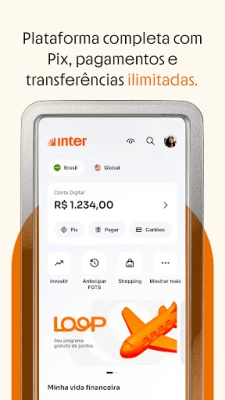 Dengan Inter, transaksi anda menjadi lebih lancar dan selamat. Manfaatkan kelajuan Pix untuk pemindahan dana segera, bersama pilihan pemindahan TED dan DOC tanpa had dan tanpa sebarang caj. Dapatkan kad kredit antarabangsa tanpa yuran tahunan, lengkap dengan program mata ganjaran dan kad maya untuk membeli-belah dalam talian yang selamat, serasi sepenuhnya dengan Google Pay Wallet. Ingin mengembangkan kekayaan anda? Platform pelaburan Inter menawarkan pelbagai pilihan, dari Home Broker dan CDB hingga dana pelaburan dan persaraan swasta. Malah, dengan 'Meu Porquinho', anda boleh mula melabur serendah R$1.00 atau mengautomasikan cashback anda untuk pulangan yang lebih baik daripada akaun simpanan tradisional. Serta, dengan akaun antarabangsa dalam dolar, hidup global anda bermula di Inter, lengkap dengan kad debit global tanpa yuran pembukaan.