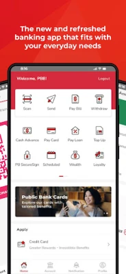 MyPB App mengubah cara anda menguruskan kewangan harian. Pindahkan dana kepada sesiapa sahaja—diri sendiri, rakan, atau keluarga—dengan fungsi Send Money yang intuitif, hanya dengan beberapa ketukan. Buat pembayaran kepada pedagang tempatan atau antarabangsa dengan pantas menggunakan DuitNow QR. Impian memiliki rumah idaman atau kereta baharu kini lebih dekat dengan ciri penilaian kemampuan, pengiraan ansuran bulanan, dan permohonan yang mudah, semuanya dari MyPB App. Lebih daripada itu, MyPB App menawarkan pandangan menyeluruh tentang kekayaan bersih anda melalui ciri 'Wealth' dan membolehkan anda memantau pendapatan dan perbelanjaan dengan papan pemuka yang direka semula untuk pemahaman kewangan yang lebih jelas.