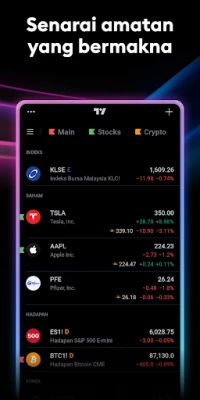 Jangan lepaskan sebarang peluang dengan senarai amatan peribadi dan pemberitahuan tersuai. Jejaki indeks global, pasangan mata wang, bon, niaga hadapan, komoditi, dan mata wang kripto secara masa nyata. Pemberitahuan pintar TradingView memastikan anda sentiasa maklum tentang perubahan pasaran sekecil mana pun, membolehkan anda bertindak pantas untuk melabur atau merealisasikan keuntungan. Nikmati kesepaduan yang sempurna; semua analisis, carta, dan tetapan akaun anda disegerakkan secara automatik antara platform TradingView dan aplikasi mudah alih anda. Akses data masa nyata daripada lebih 100,000 instrumen dari lebih 50 bursa global, termasuk NYSE, LSE, Bursa Malaysia, NASDAQ, dan banyak lagi. Dari harga emas, perak, dan minyak hingga indeks utama seperti Dow Jones, S&P 500, NIKKEI 225, dan SHANGHAI COMPOSITE, serta perbandingan harga kripto, semua di hujung jari anda.