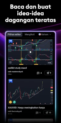 TradingView bukan sekadar alat analisis, ia adalah sebuah komuniti pedagang dan pelabur paling aktif di dunia. Sertai jutaan ahli dari serata global, bertukar pandangan, pelajari strategi baharu daripada pengalaman pelabur lain, dan rancakkan perbincangan idea perdagangan yang inovatif. Selain itu, nikmati pengalaman carta termaju yang mengatasi kualiti platform atas meja tradisional. Dengan lebih daripada 10 jenis carta, daripada garisan asas hingga Renko dan Kagi yang berfokus pada perubahan harga, anda akan memiliki perspektif pasaran yang lengkap. Manfaatkan ratusan alat analisis harga termasuk penunjuk, strategi, dan objek lukisan canggih seperti Gann dan Elliot Wave untuk membuat keputusan yang termaklum.